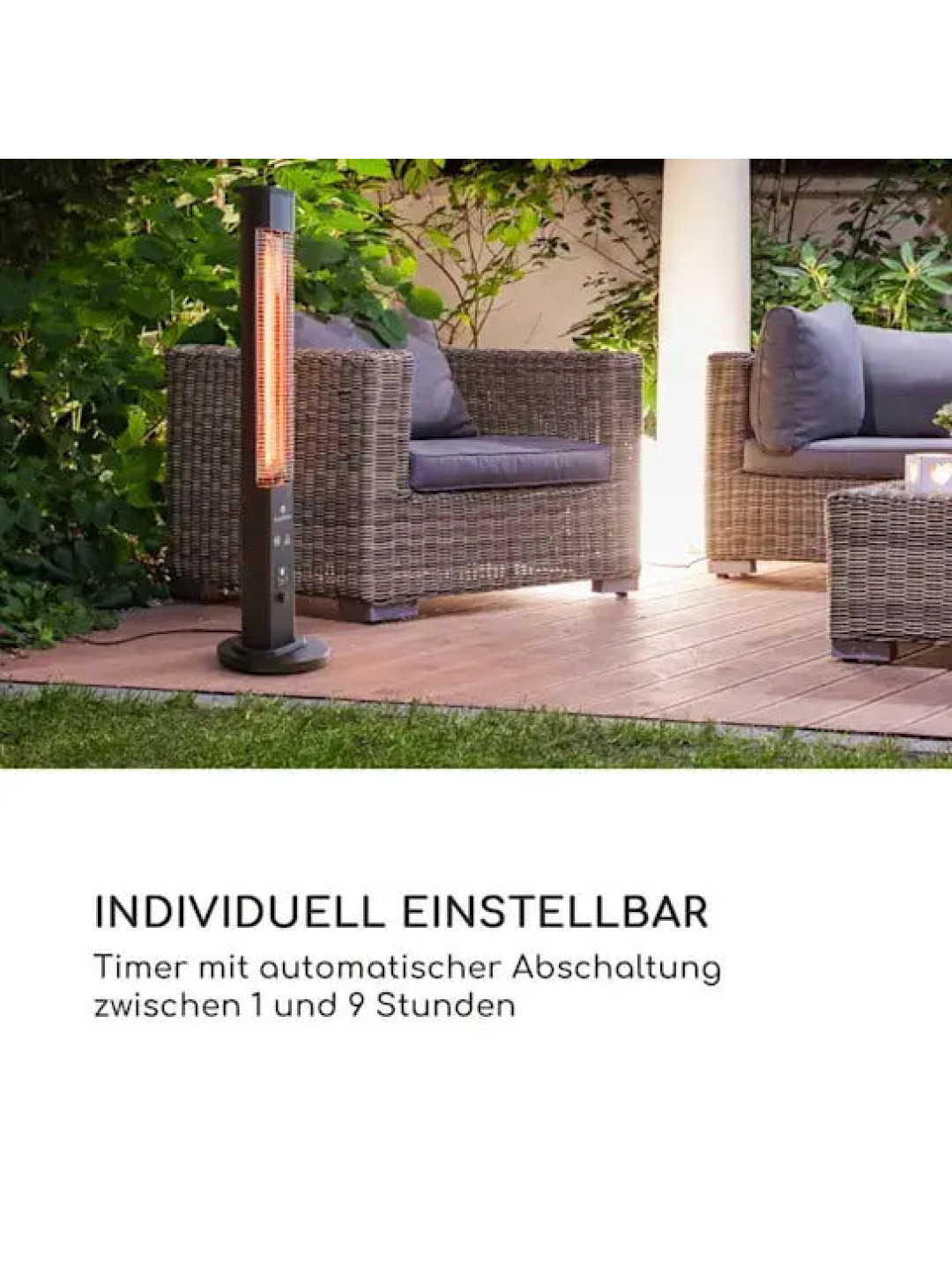 Середньохвильове інфрачервоне випромінювання у поєднанні з високоефективним відбивачем забезпечує рівномірний та глибокий прогрів, створюючи комфортну атмосферу для кількох людей одночасно. Вбудований таймер із діапазоном від 1 до 9 годин дозволяє автоматизувати роботу пристрою та оптимізувати споживання електроенергії.